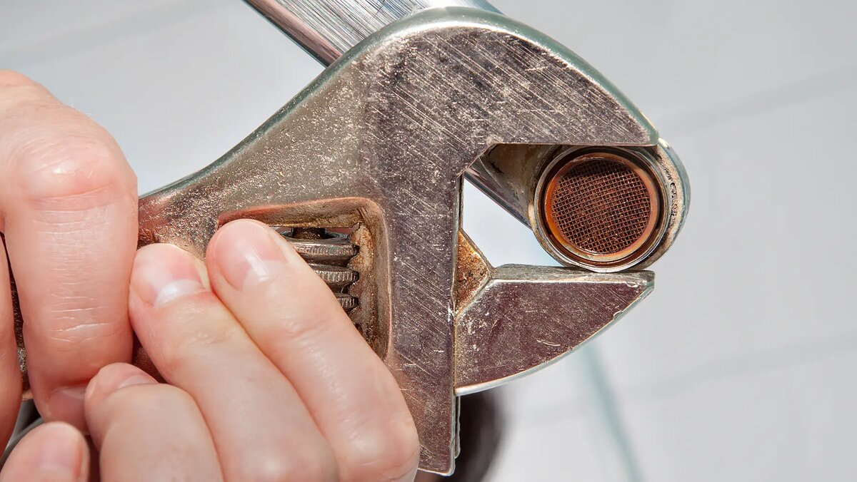 Dengan bantuantang atau kunci inggris, lepaskan aerator. Hal ini tidak akan sulit, karena dengan sedikit tekanan, aerator akan terlepas dengan mudah.