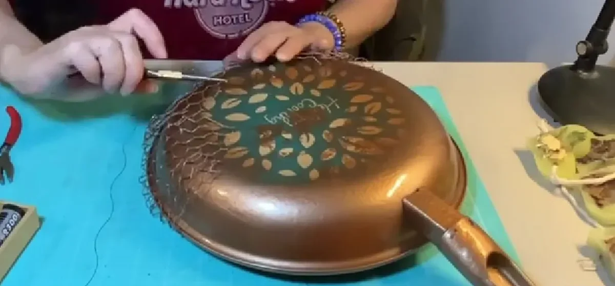 Setelah bagian-bagiannya kering, kita lanjutkan dengan memasang jaring ke wajan. Pertama-tama, kita akan membuat cetakan dengan meletakkan jaring di atas bagian tengah wajan. Dengan menggunakan penjepit, tekuk jaring agar menutupi tepinya dan lipat kelebihannya ke bagian belakang.