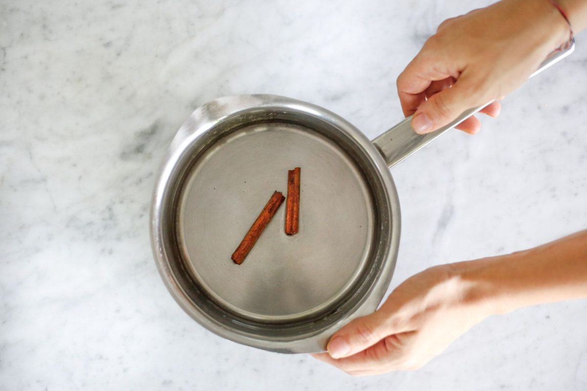 - Panaskan air sedikit (jangan sampai mendidih) dan tambahkan batang kayu manis agar aromanya terlepas. Diamkan selama beberapa menit.