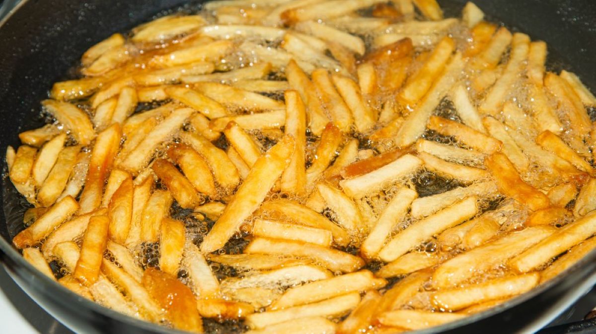 - Goreng kentang dalam minyak yang sangat panas hingga berwarna cokelat keemasan.