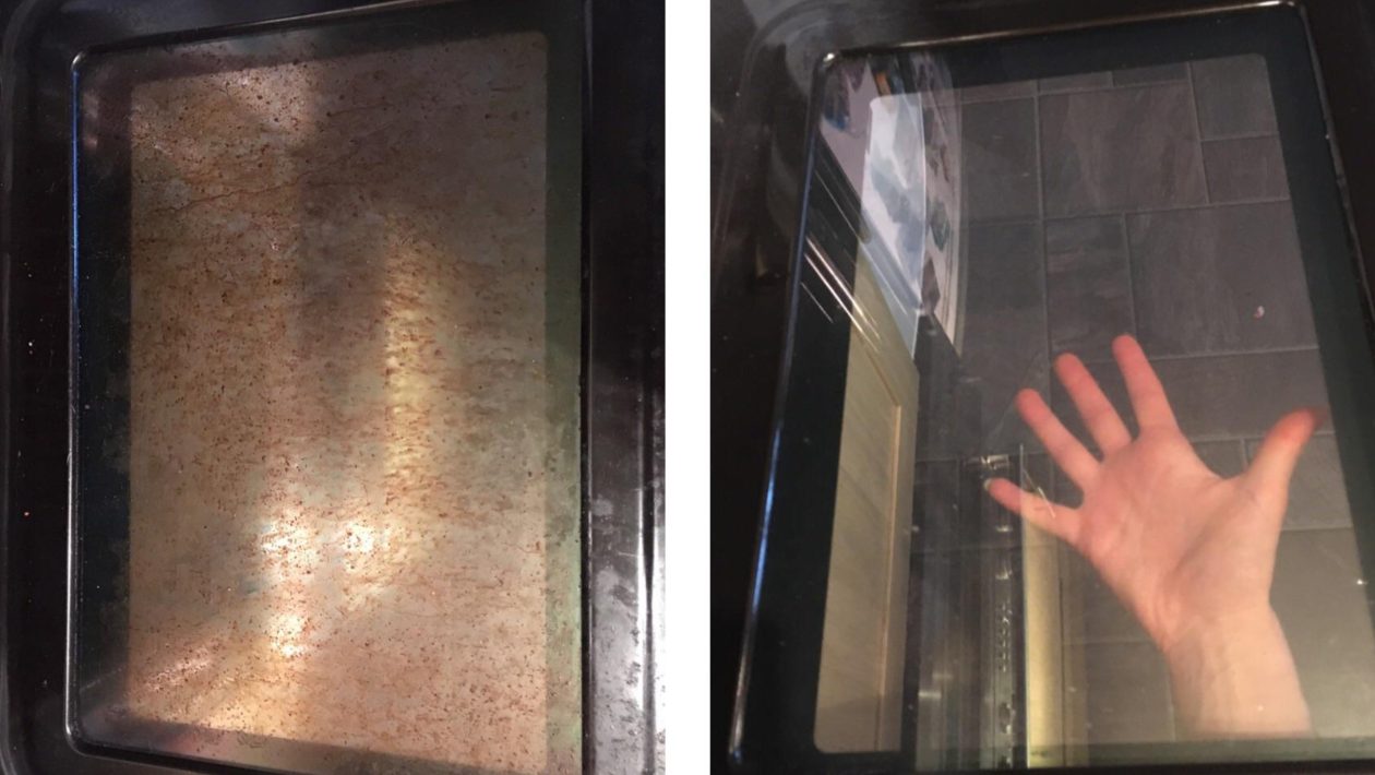 Untuk menghilangkan sisa-sisa pembersihan, disarankan untuk membersihkan kaca dengan larutan air dan cuka, lalu keringkan dengan kain bersih untuk menghindari noda. Perlu diperhatikan bahwa pintu oven memiliki celah di antara panel kaca yang juga dapat menumpuk noda; namun, untuk menjangkau area tersebut, Anda harus melepas pintu karena tidak mungkin membersihkannya dari luar.