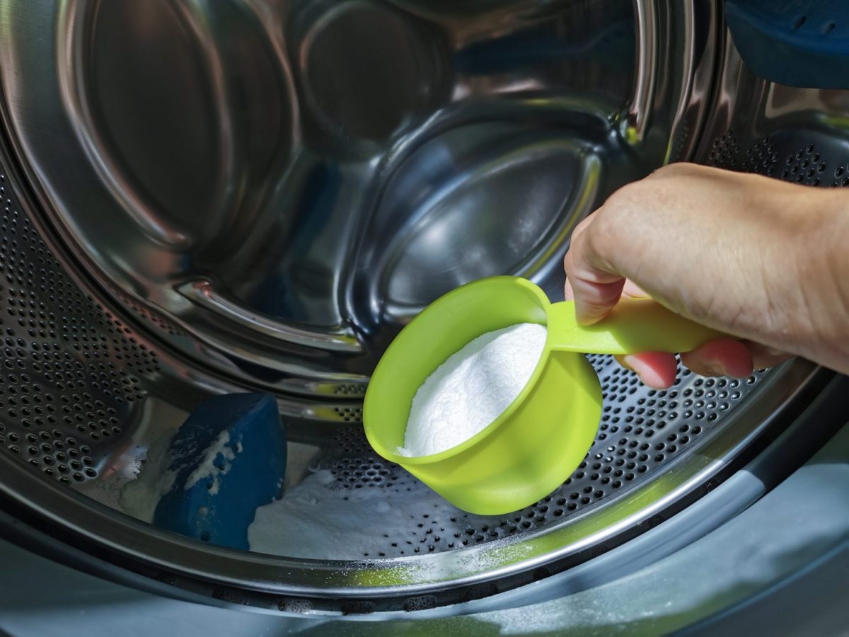 4. Setelah selesai, biarkan handuk di dalam dan ulangi pencucian, kali ini dengan setengah cangkir bikarbonat langsung ke dalam drum.